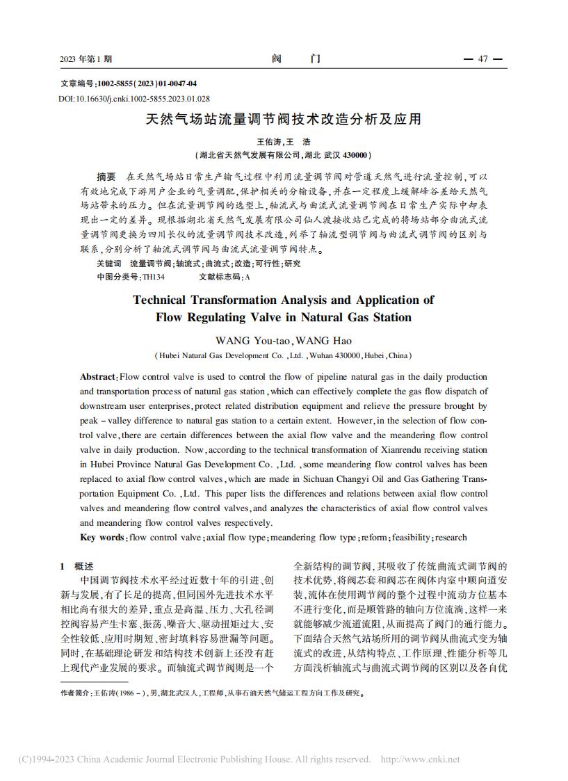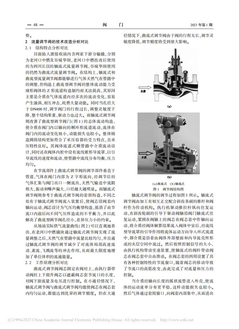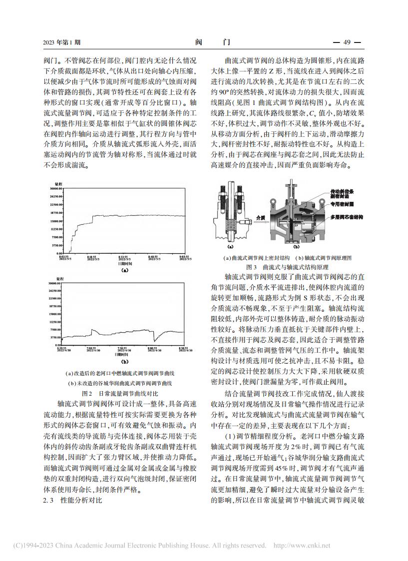 文章摘要:摘要 在天然气场站日常生产输气过程中利用流量调节阀对管道天然气进行流量控制,可以 有效地完成下游用户企业的气量调配,保护相关的分输设备,并在一定程度上缓解峰谷差给天然气 场站带来的压力。 但在流量调节阀的选型上,轴流式与曲流式流量调节阀在日常生产实际中却表 现出一定的差异。 现根据湖北省天然气发展有限公司仙人渡接收站已完成的将场站部分曲流式流量调节阀更换为四川长仪的流量调节阀技术改造,列举了轴流型调节阀与曲流式调节阀的区别与 联系,分别分析了轴流式调节阀与曲流式流量调节阀特点。